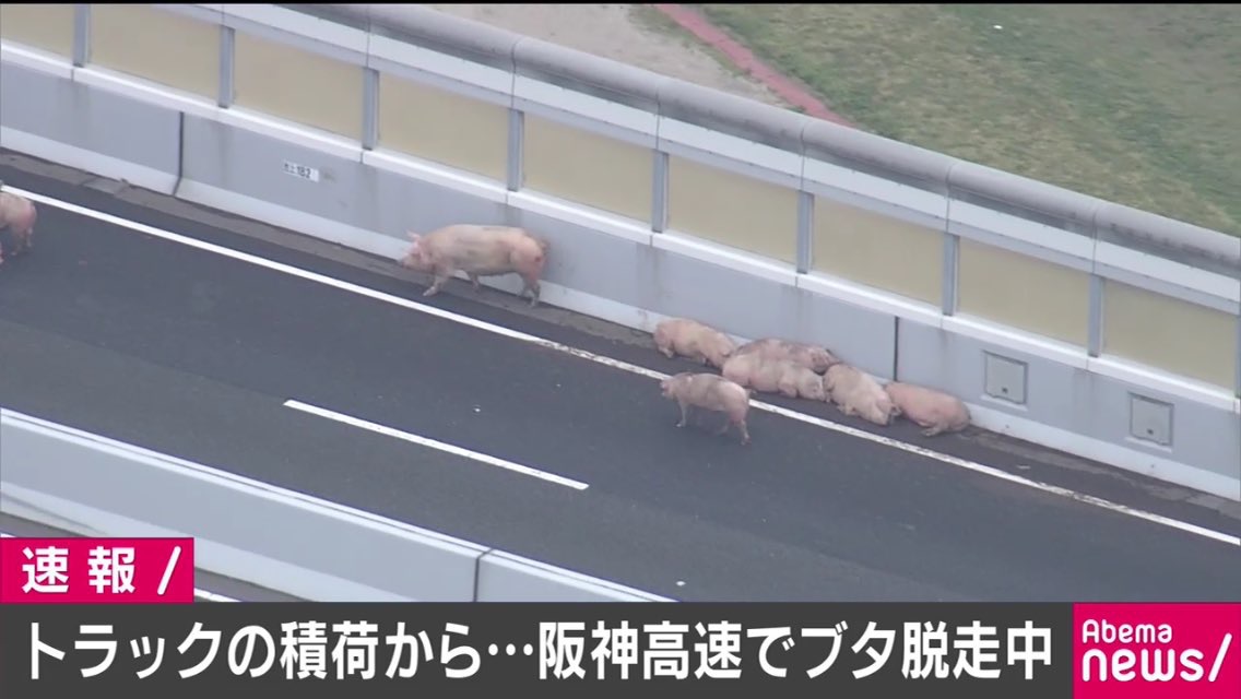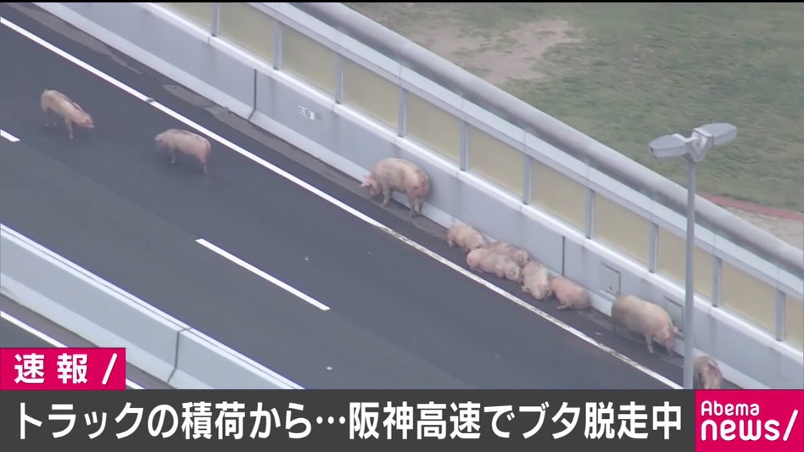 警察によりますと、トラックが別のトラックを追い越す際に接触し、トラックに積まれていた豚37頭のうち19頭が逃げ出したということです。