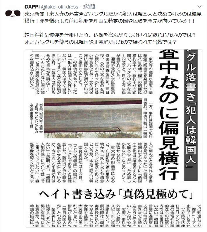 東京新聞「東大寺の落書きがハングルだから犯人は韓国人と決めつけるのは偏見横行!罪を憎むより前に犯罪を理由に特定の国や民族を矛先が向いている!」
