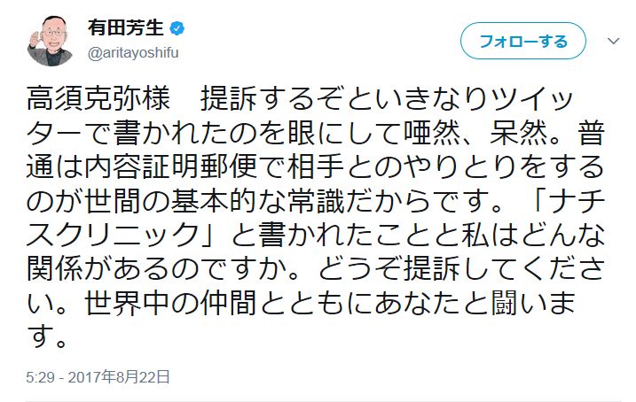 高須克弥様 提訴するぞといきなりツイッターで書かれたのを眼にして唖然、呆然。普通は内容証明郵便で相手とのやりとりをするのが世間の基本的な常識だからです。「ナチスクリニック」と書かれたことと私はどんな関係があるのですか。どうぞ提訴してください。世界中の仲間とともにあなたと闘います。