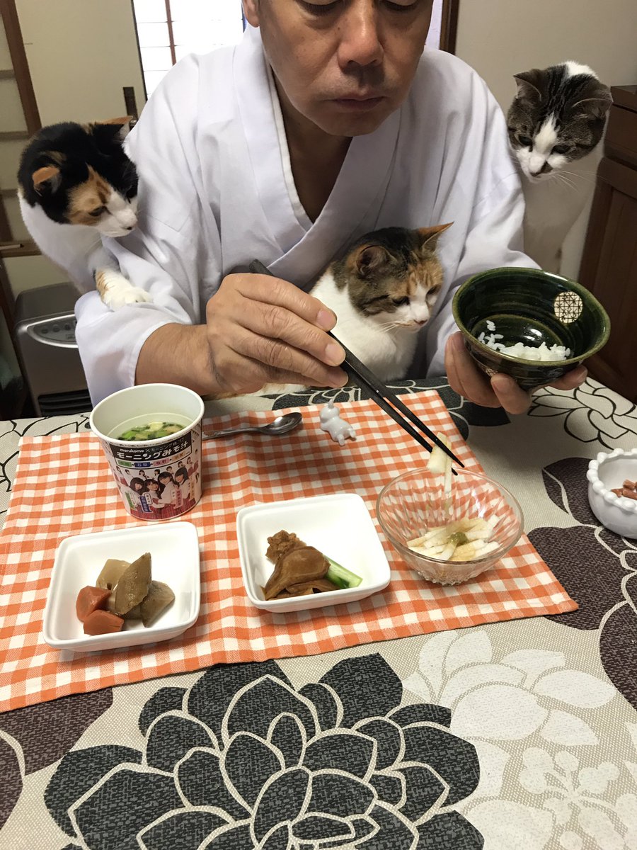 ネコに包囲される那須の長楽寺住職の朝ごはんの様子wwwwwwwwwwwwwww