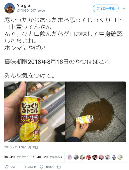 賞味期限2018年8月16日とのことで、期限的には問題ないはず。実際に中身をぶちまけている画像も投稿されており、それを見ると真っ黒なコーンスープが……。