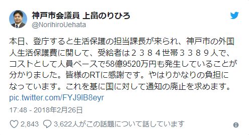 本日、登庁すると生活保護の担当課長が来られ、神戸市の外国人生活保護費に関して、受給者は2384世帯3389人で、コストとして人員ベースで58億9520万円も発生していることが分かりました。皆様のRTに感謝です。やはりかなりの負担になっています。これを基に国に対して通知の廃止を求めます。