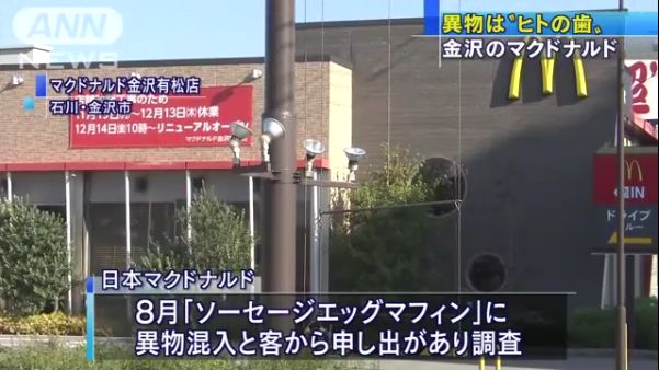 日本マクドナルド「ソーセージエッグマフィン」から“ヒトの歯”3個 金沢