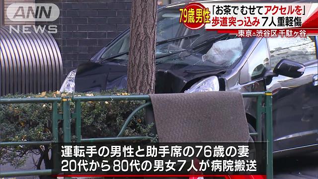男性は妻と埼玉県で葬式に出て、帰宅途中だった。調べに対し、「ペットボトルのお茶を飲んだらむせて、吐き出した。驚いてブレーキかアクセルを踏んだが、その後の記憶はない」と話しているという。原宿署は、男性がむせた際に、誤ってアクセルを踏み込んだとみている。