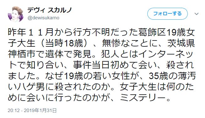 デヴィ夫人は「昨年11月から行方不明だった葛飾区19歳女子大生(当時18歳)、無惨なことに、茨城県神栖市で遺体で発見。犯人とはインターネットで知り合い、事件当日初めて会い、殺されました。なぜ19歳の若い女性が、35歳の薄汚いハゲ男に殺されたのか」と怒り。