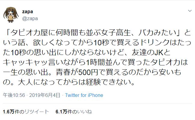 「タピオカ屋に何時間も並ぶ女子高生、バカみたい」という話、