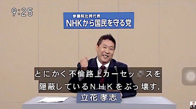 参院選期間中にNHKで放送された立花氏の「NHKをぶっ壊す!」の政見放送は、ユーチューブ等の動画サイトで拡散され、320万回以上も再生されている。