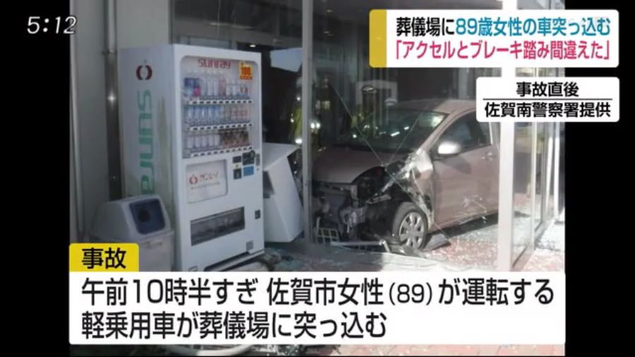 この事故で運転していた89歳の女性が軽傷です。29日午前10時半すぎ、佐賀市川副町の葬儀場の 出入り口付近に、佐賀市の89歳の女性が運転する軽乗用車が突っ込みました。