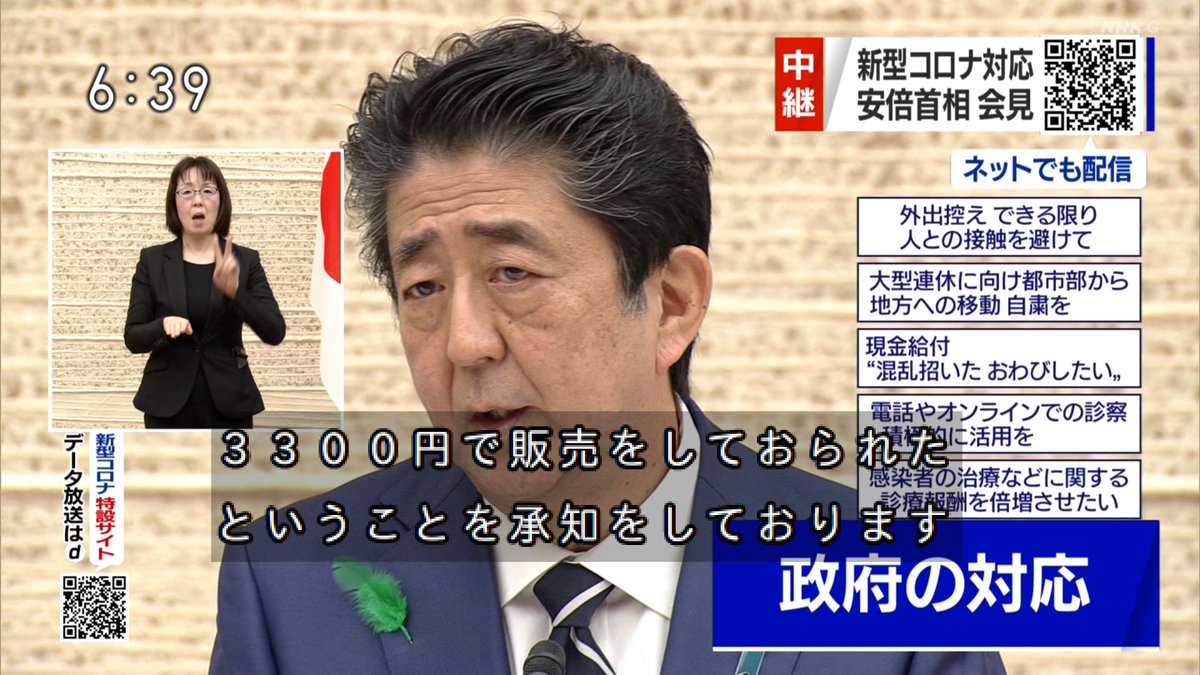 安倍総理「布マスクはサージカルマスクを医療機関にしっかりと配布するためであり、御社でも3300円で販売してたように需要はある。動画は若い皆さんに外出自粛の声を伝えるための工夫であったが批判は受止めてる」
