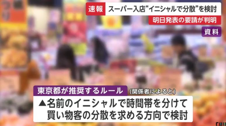 関係者によると、23日に発表される東京都が推奨するルールでは、スーパーでの買い物は、できるだけ1人で行く、間隔をあけて並ぶなどのほか、名前のイニシャルで時間帯を分けて買い物客を分散させるなどの協力を求める方向で検討しているという。