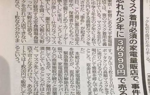 マスク必須の家電量販店に入店した中学生、「3枚990円」でマスク売りつけられる→親が激怒し警察に通報