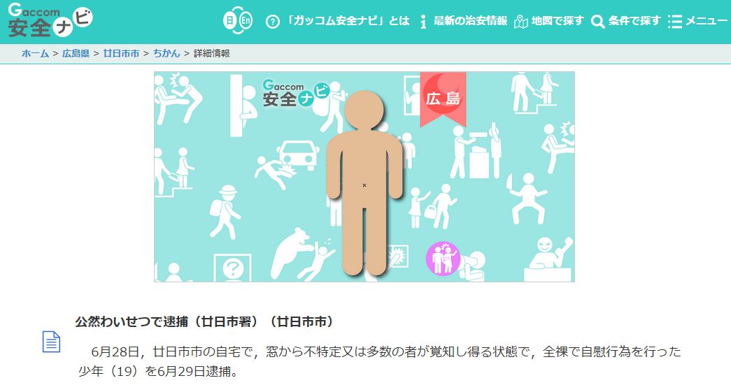 6月28日,廿日市市の自宅で,窓から不特定又は多数の者が覚知し得る状態で,全裸で自慰行為を行った少年(19)を6月29日逮捕