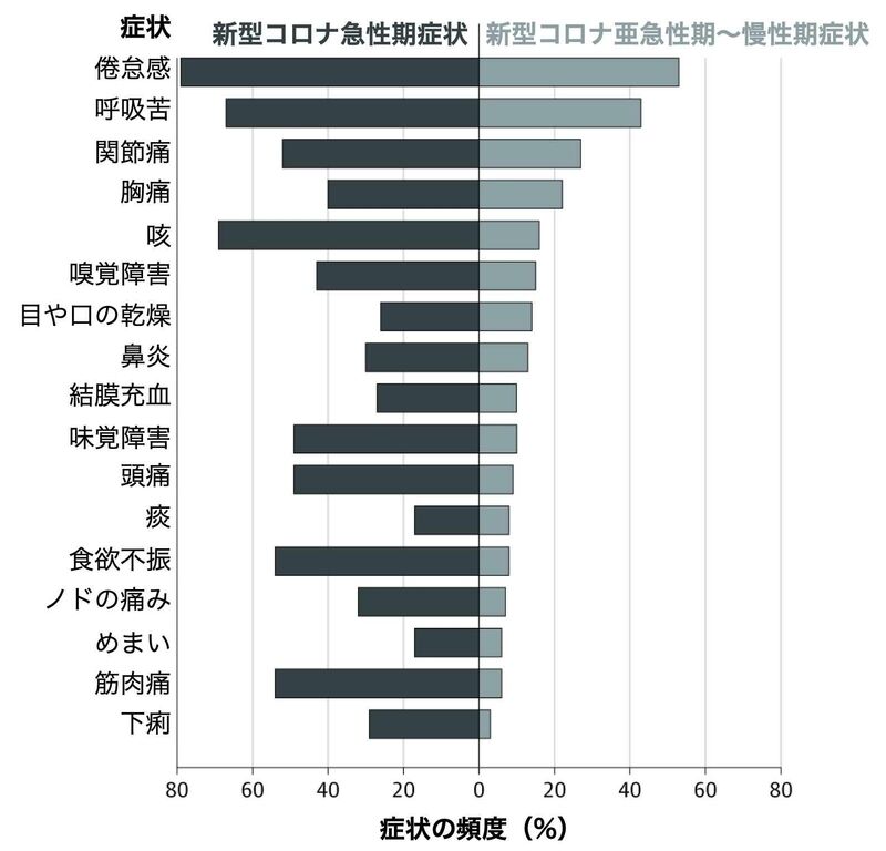 これによると、新型コロナから回復した後(発症から平均2ヶ月後)も87.4%の患者が何らかの症状を訴えており、特に倦怠感や呼吸苦の症状が続いている方が多いようです。
