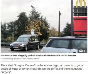 英ケント州ボートン・モンチェルシー在住のデボラ・カーライルさん(Deborah Carlisle、57)は、同州アイルズフォード近くのマクドナルドの駐車場で購入したハンバーガーを霊柩車の中で食べるスタッフを目撃した。この霊柩車には遺体が入った棺が積み込まれており、搬送の途中だった。