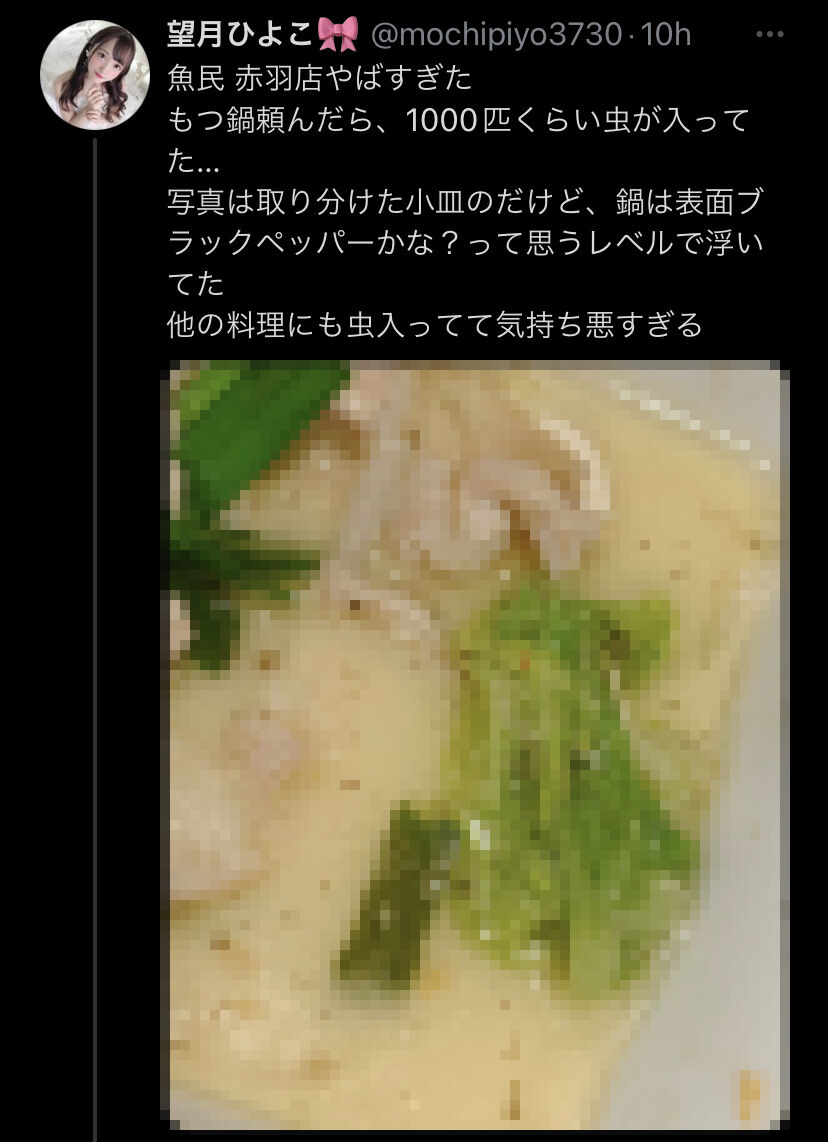 【画像】「魚民でもつ鍋頼んだら、1000匹くらい虫が入ってた」…Twitterで話題に