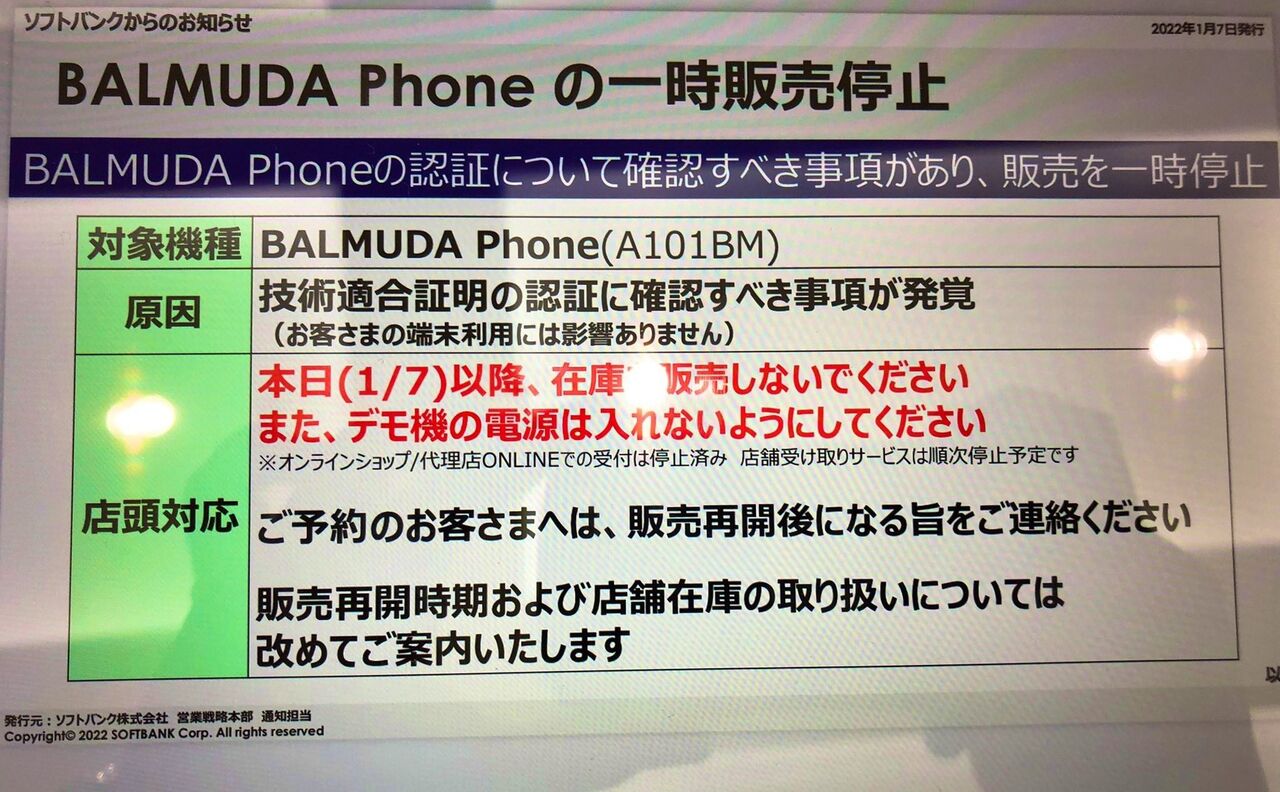 複数のSoftBank販売店がスマートフォン「BALMUDA Phone(バルミューダフォン)」の販売を停止していることがわかりました。弊誌ライターが都内販売店にて確認しました。